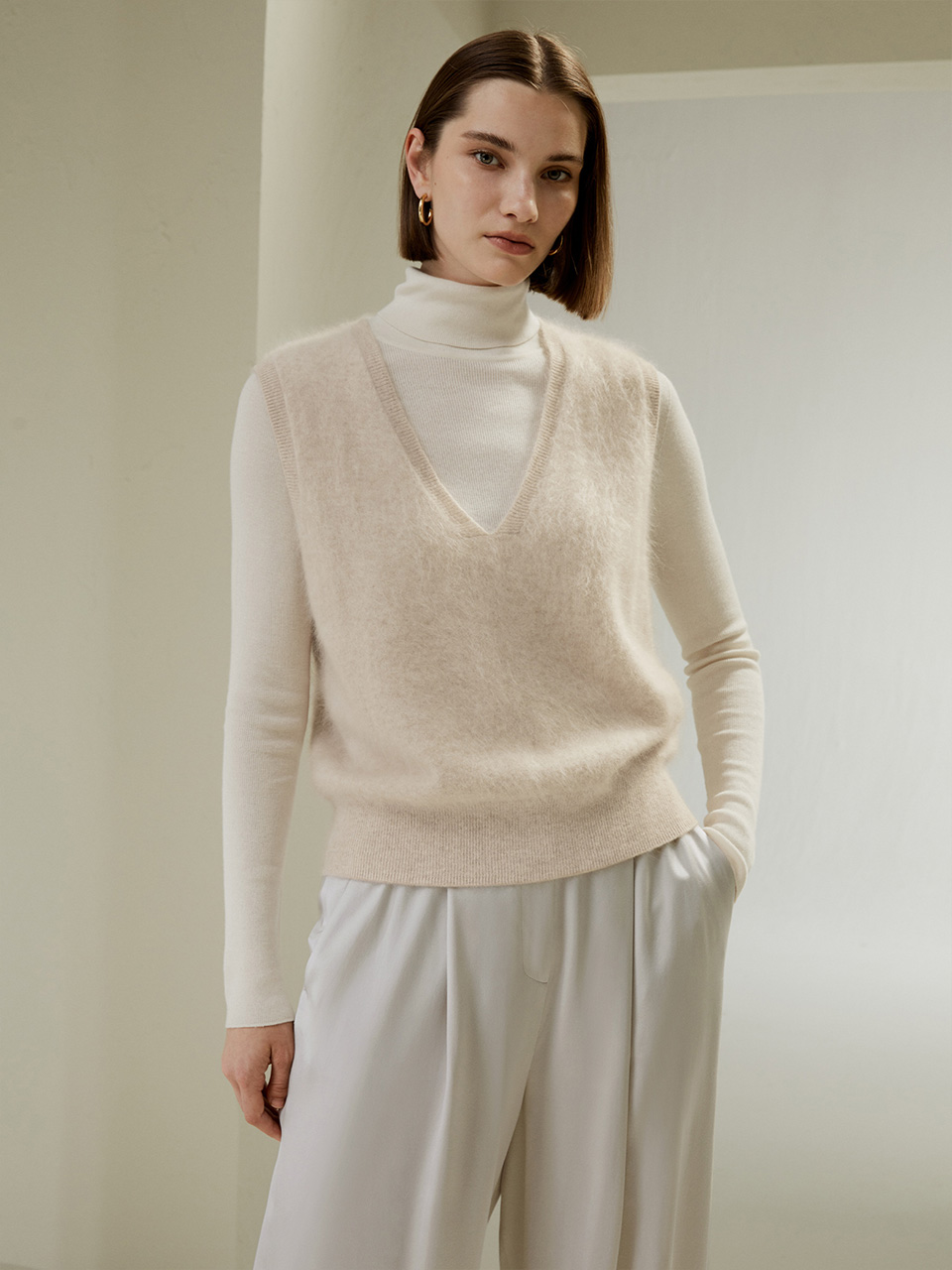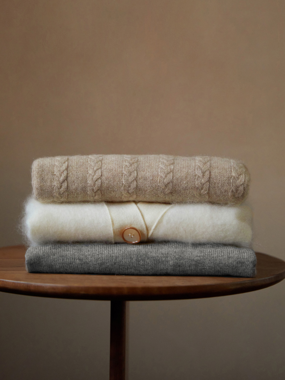 니트 한 벌을 만들려면 19마리의 아기 염소의 원모가 필요합니다. 이 소재는 아기 피부처럼 부드러울 뿐만 아니라 가볍고 섬세한 촉감도 있습니다. 베이비 캐시미어 길이는 34~36mm로 매우 부드럽고 다른 캐시미어보다 따뜻합니다.더 보기