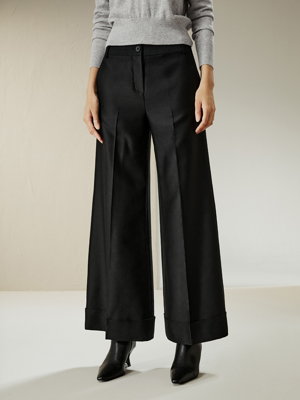 이 혼방 원단은 부드럽고 광택이 있어 피부에 닿는 느낌이 매우 좋습니다. 울의 보온성과 실크의 흡습성을 결합해 겨울에는 따뜻하고 여름에는 시원하게 착용할 수 있습니다. 또한 울의 탄력과 실크의 매끄러움이 어우러져 구김을 방지하고 아름다운 실루엣을 유지할 수 있습니다.