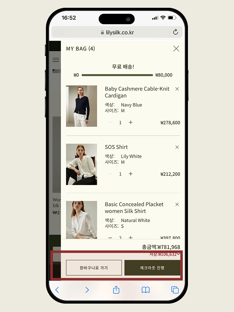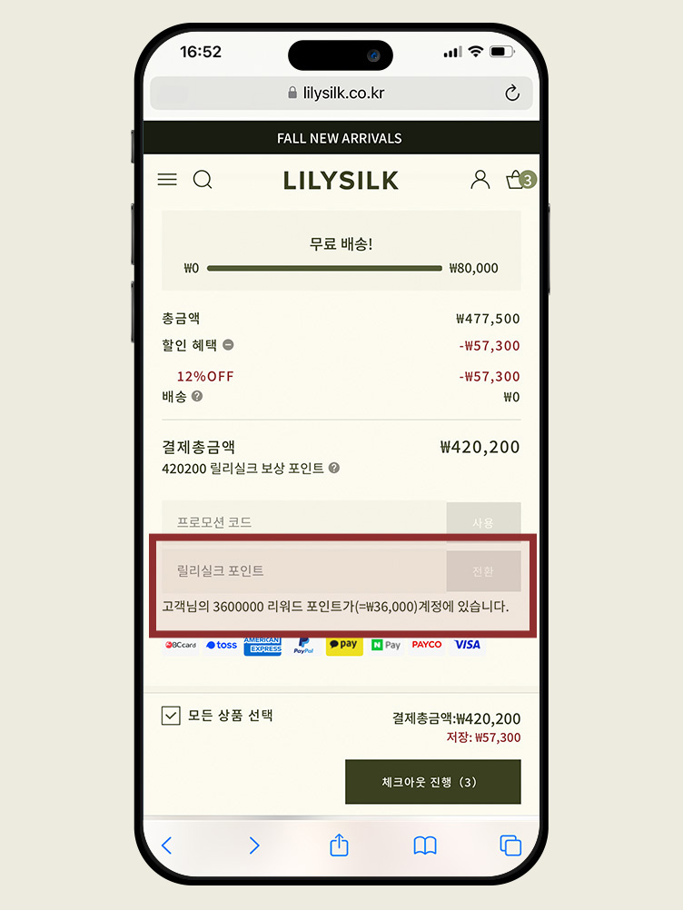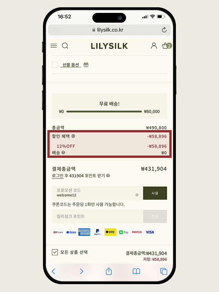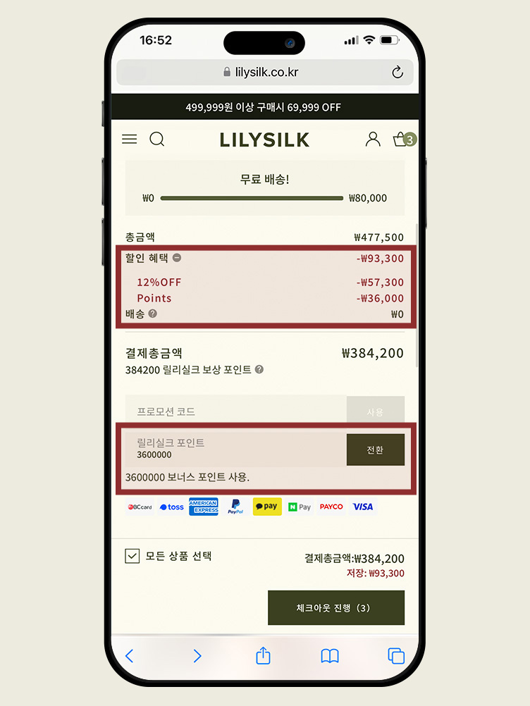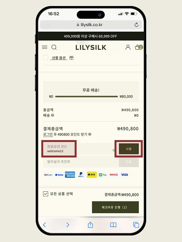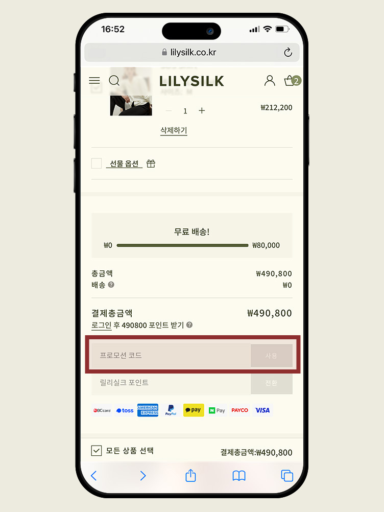 STEP3장바구니 또는 결제 페이지로 이동하여 사용 가능한 쿠폰과 포인트를 입력하세요. 로그인 상태를 유지하시면 증정 선물 및 포인트 등 멤버십 혜택을 받을 수 있습니다. 회원이 아니라면 먼저 가입해 주세요.