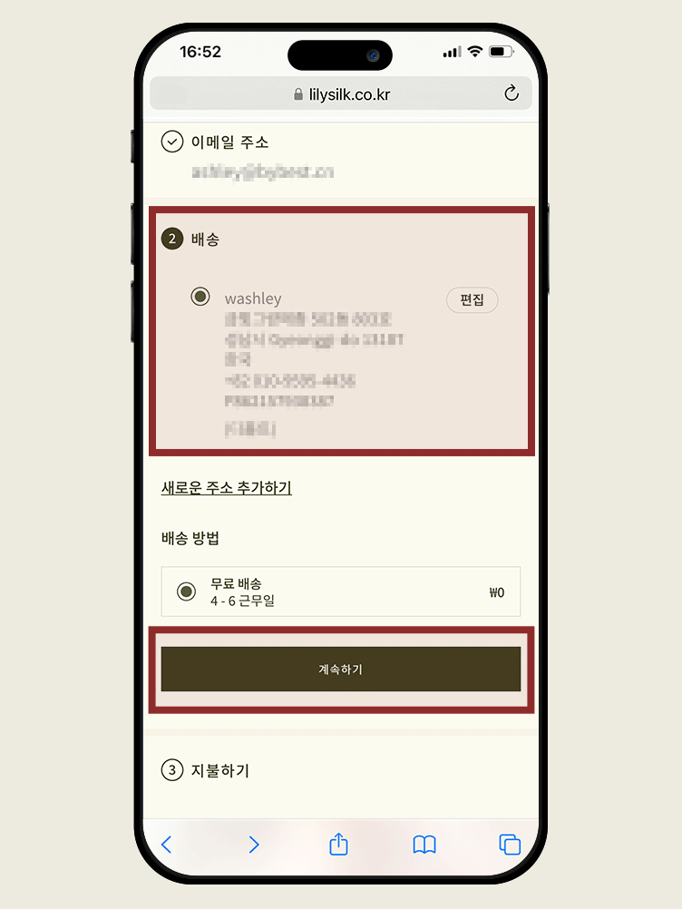 STEP4배송 주소를 입력하고 확인한 다음 결제 방법을 선택하여 결제를 완료하세요. 결제가 완료되면 주문 확인 이메일이 발송됩니다.