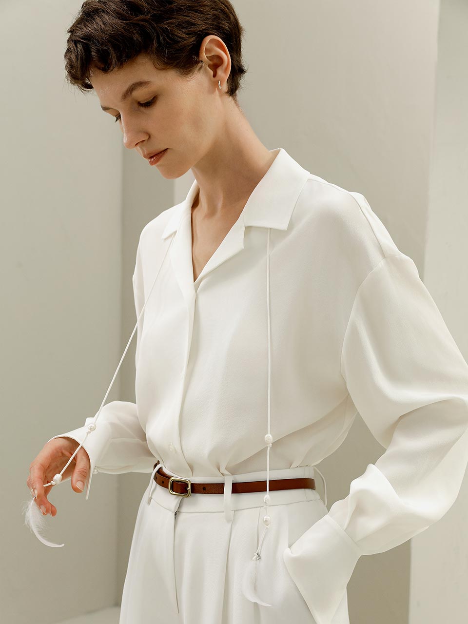유니크한 도트 무늬의 실크 러플 소매 디자인이 이 셔츠의 매력을 더해줍니다. 시어리한 소재를 사용하여 이너탑과 매치하여 착용, 혹은 다양항게 착용 가능합니다.