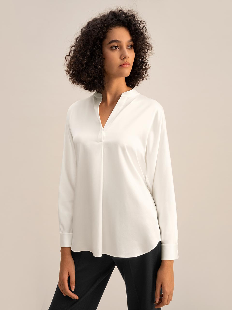 이 고급스러운 풀오버 탑은 실크 더블 조젯 원단으로 제작되어 심플하면서도 세련된 룩을 연출할 수 있습니다.