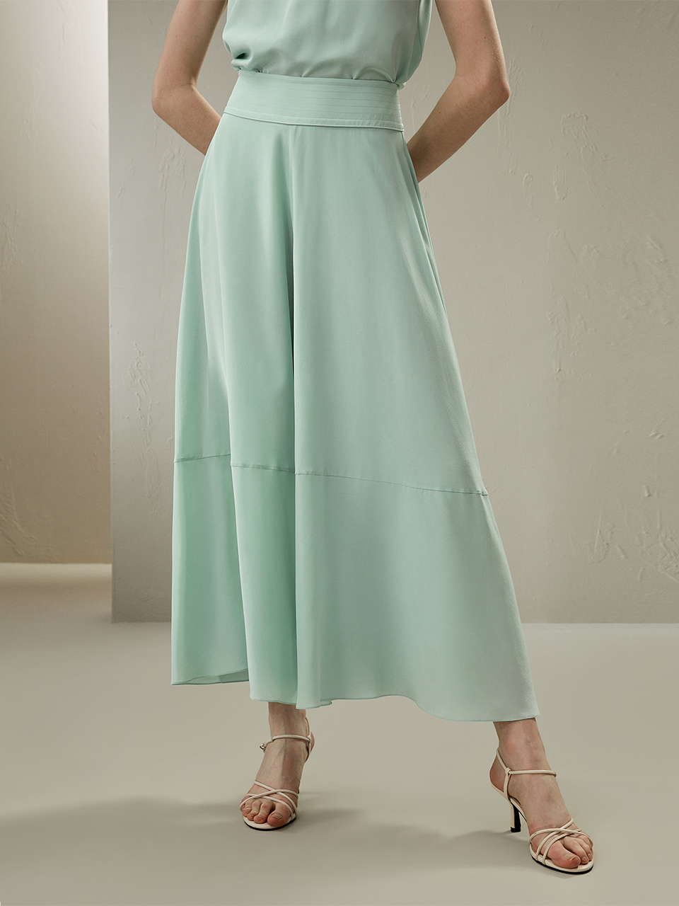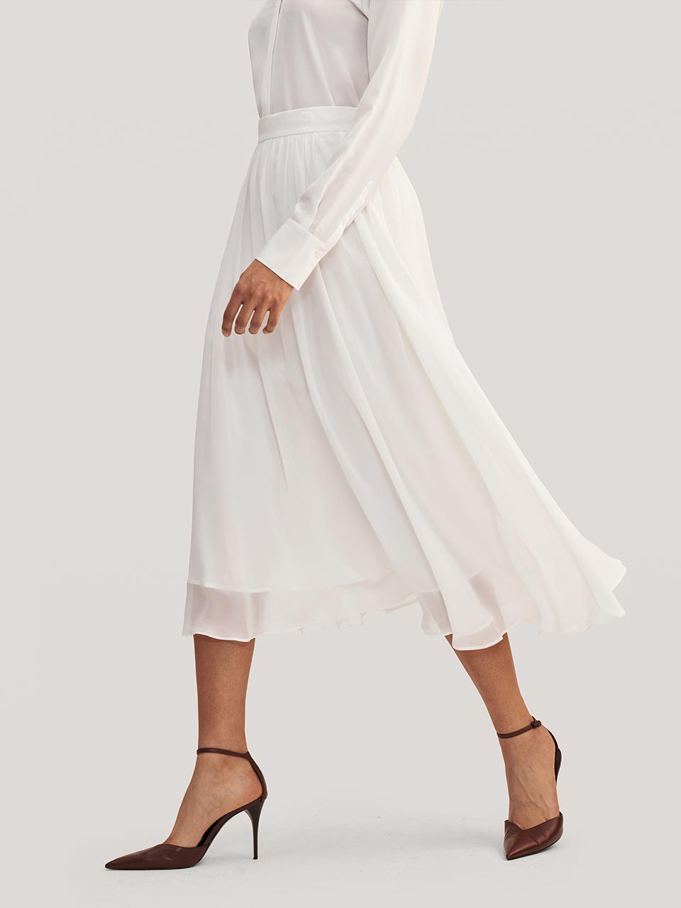 있는 스커트입니다. 실크 셔츠와 모자를 매치해 리조트 룩을