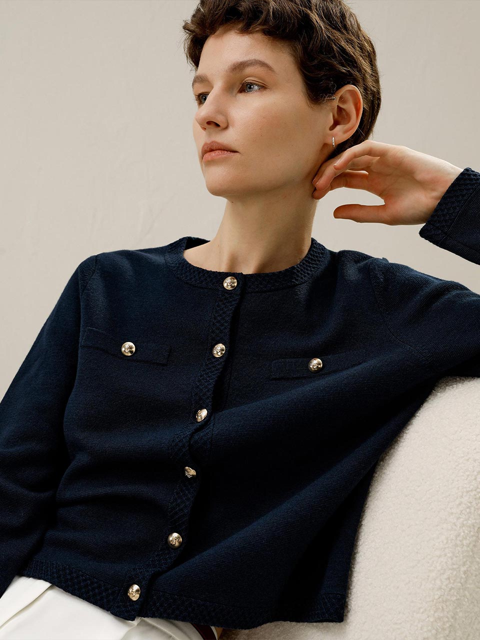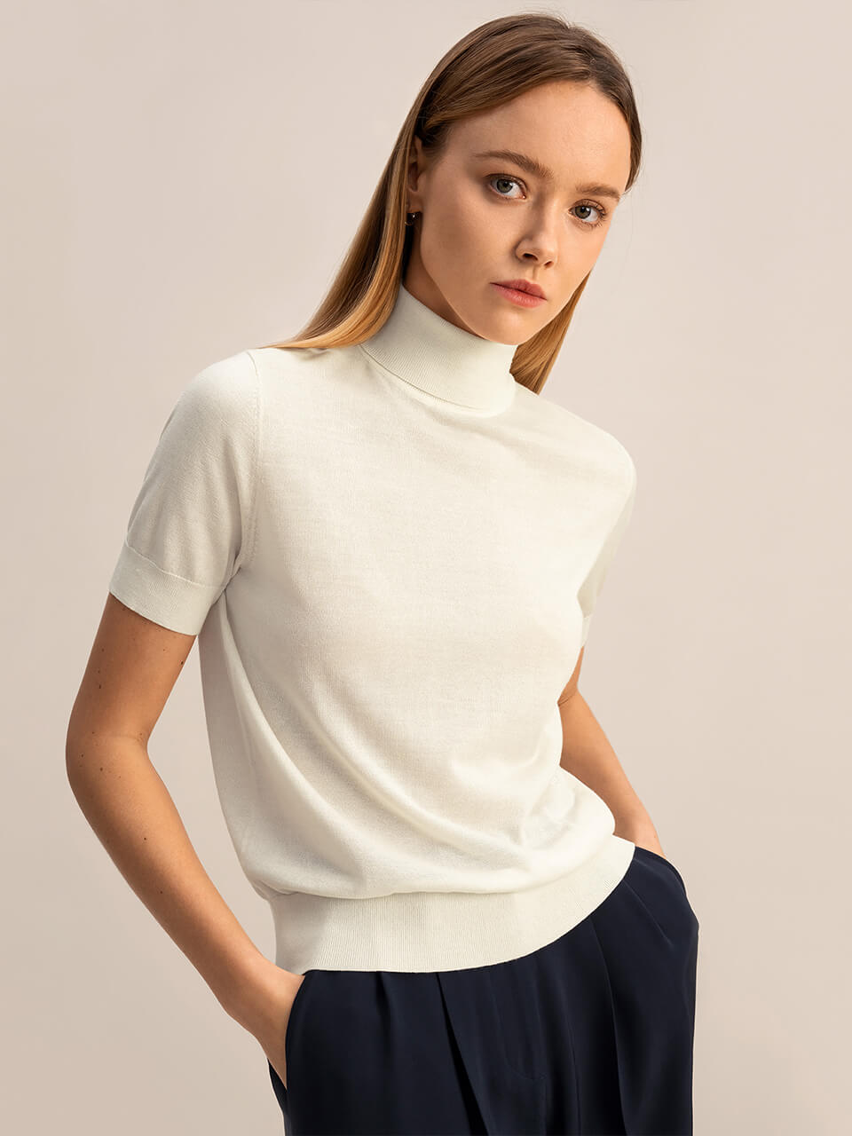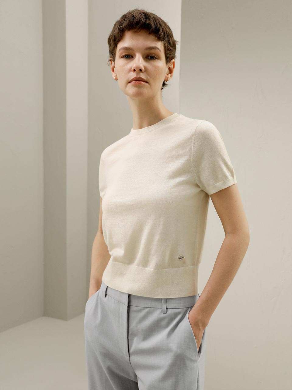 이 니트 탑은 실크의 고급스러움과 광택을 유지하며 케이블 무늬가 덜