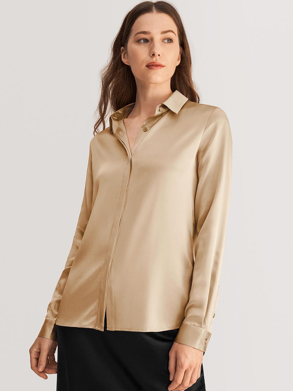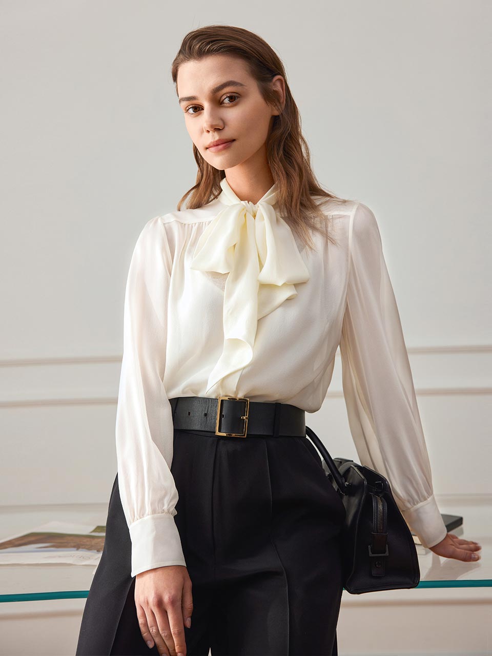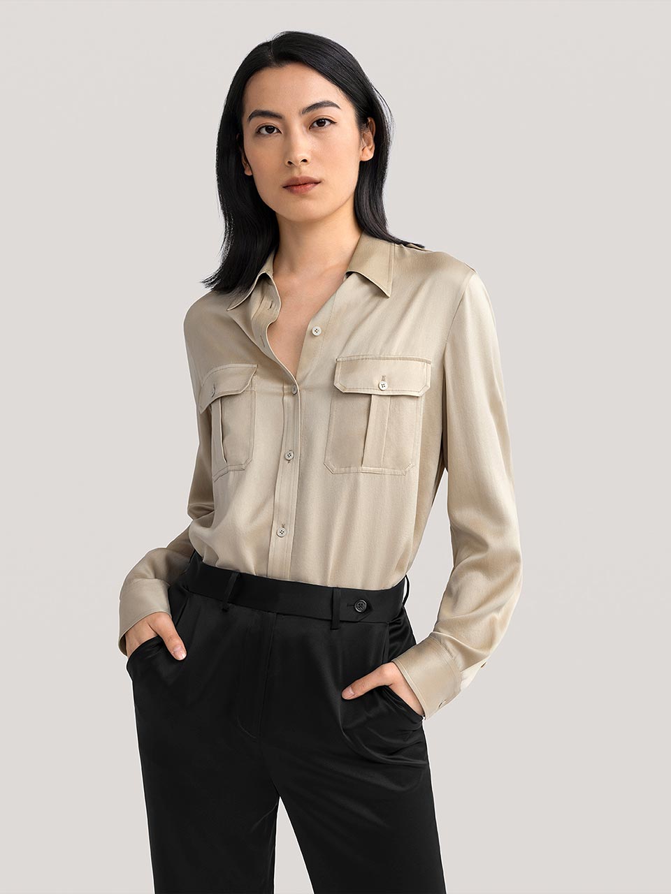 이 올리브 그린 블라우스는 프리미엄 실크를 일상화할 수 있으며 쉬폰