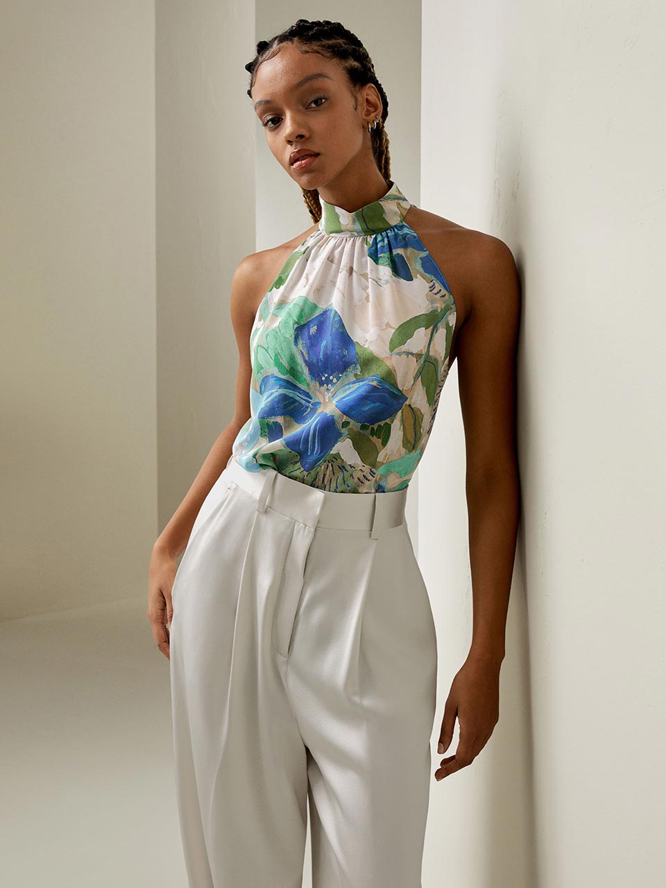 이 슬리브리스 홀터 탑은 플리츠 주름 디자인으로 고급스러운 느낌을