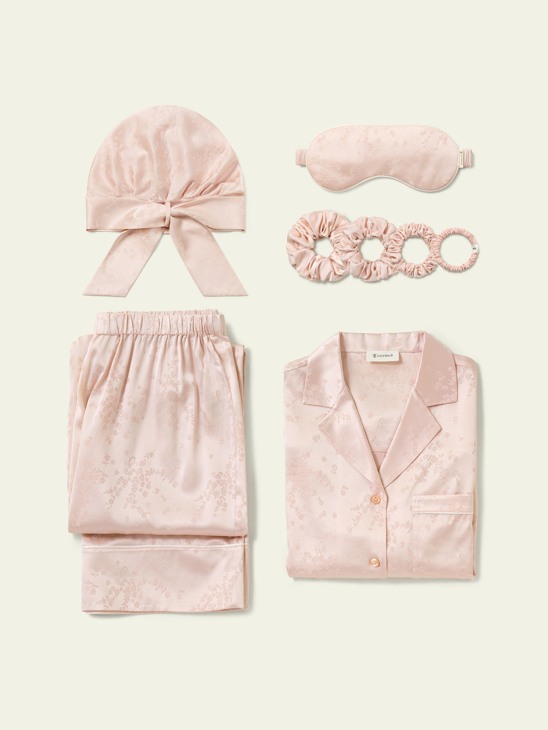 어머니를 향한 존경과 사랑을 담은 세레니티 블라썸 텐더 모먼츠 세트는 절제된 우아함 속에서 평온한 휴식을 제안합니다. 19Momme 스트레치 자카드 샤르무즈 소재의 롱 슬리브 파자마는 유연하고 부드러운 핏을 선사하며, 온종일 집안에서 여유를 즐기거나 긴 하루 끝에 긴장을 풀기에 이상적입니다. 빛을 부드럽게 차단하는 실크 수면 안대, 모발 마찰을 최소화하는 슬립 캡, 그리고 다양한 사이즈의 스크런치 4종이 함께 구성되어 완벽한 세트를 이룹니다. 모든 피스에 정교하게 새겨진 체리 블라썸 패턴은 변치 않는 아름다움을 더해줍니다. 평온한 주말 아침부터 고요한 저녁까지, 소중한 분께 럭셔리한 휴식과 감동을 전하는 최고의 선물이 될 것입니다.